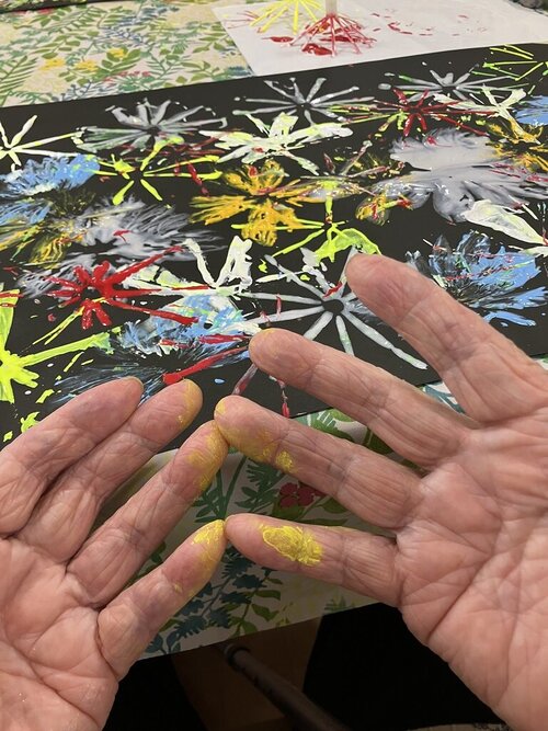 手が絵の具で染まるのも気にせず、作品づくりに熱中される方も。