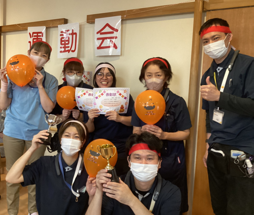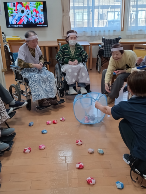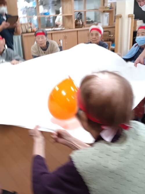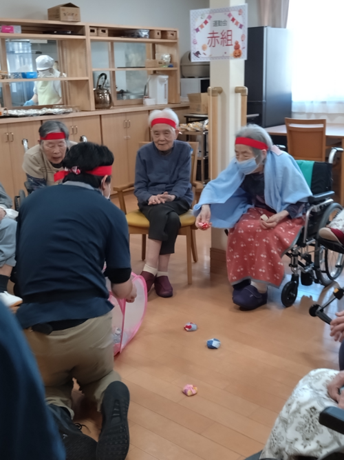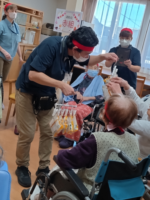 ご入居者もケアスタッフもハチマキを締め、気合十分!